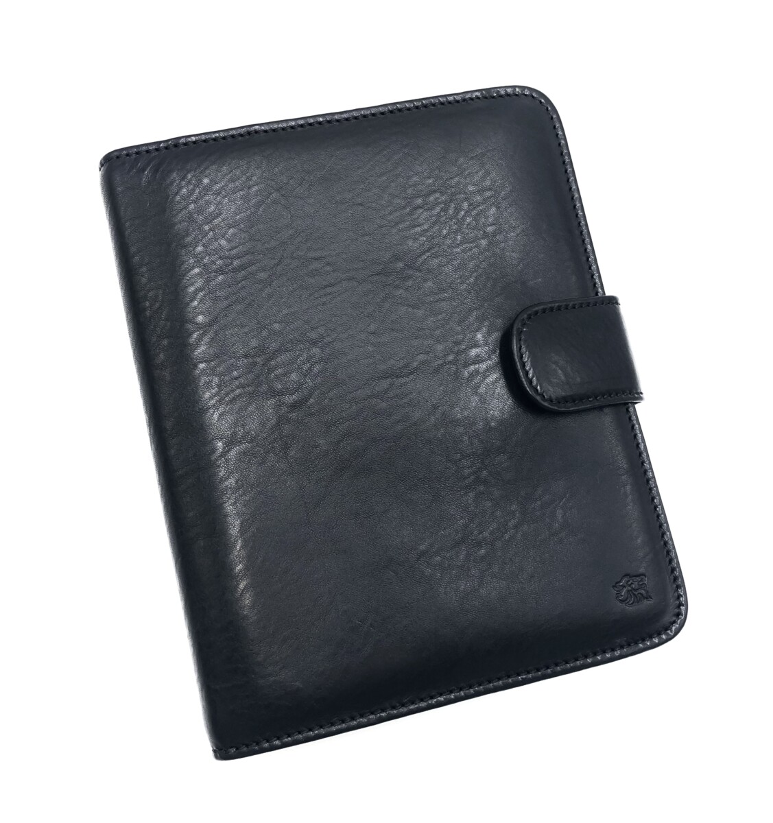 Agenda organizer in pelle con finiture in tinta e logo impresso a fuoco.