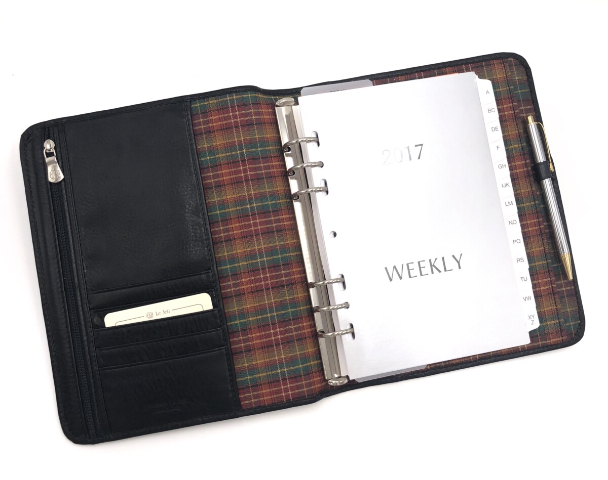 Agenda settimanale organizer intercambiabile ad anelli completa di rubrica e comode pagine per lavoro, tempo libero, contabilità e note.