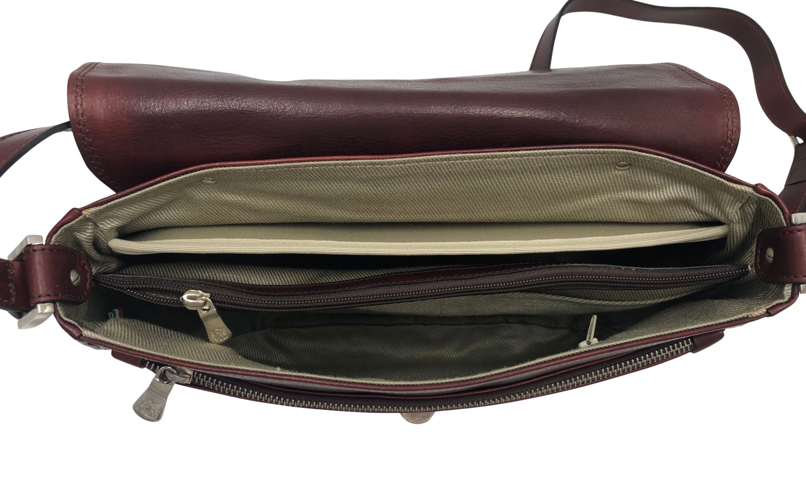 All’interno due spazi separati da comparto centrale chiuso con zip.