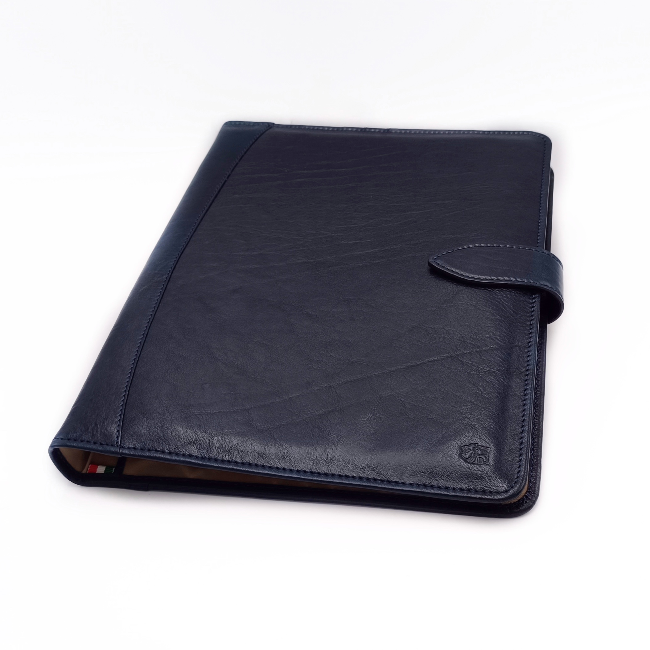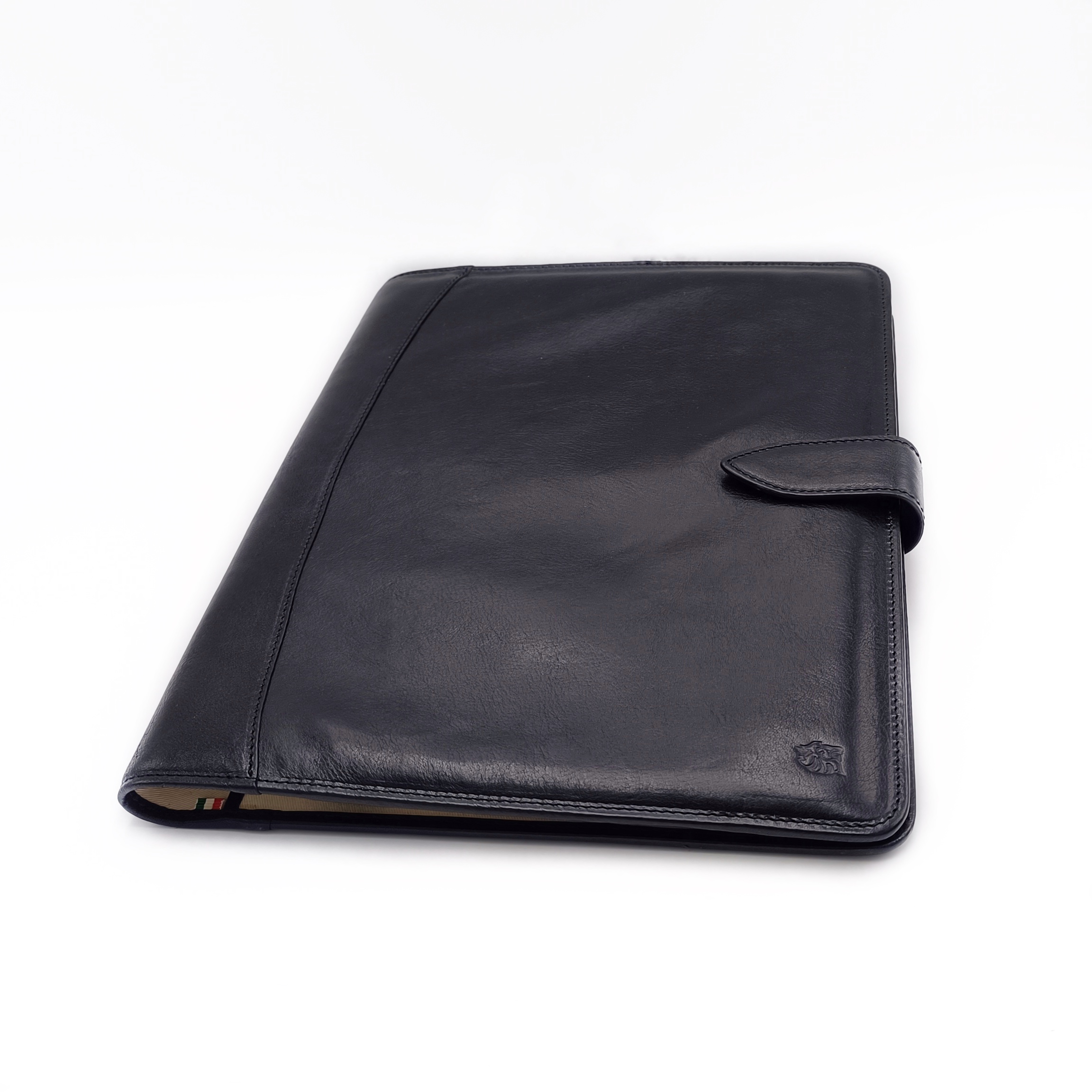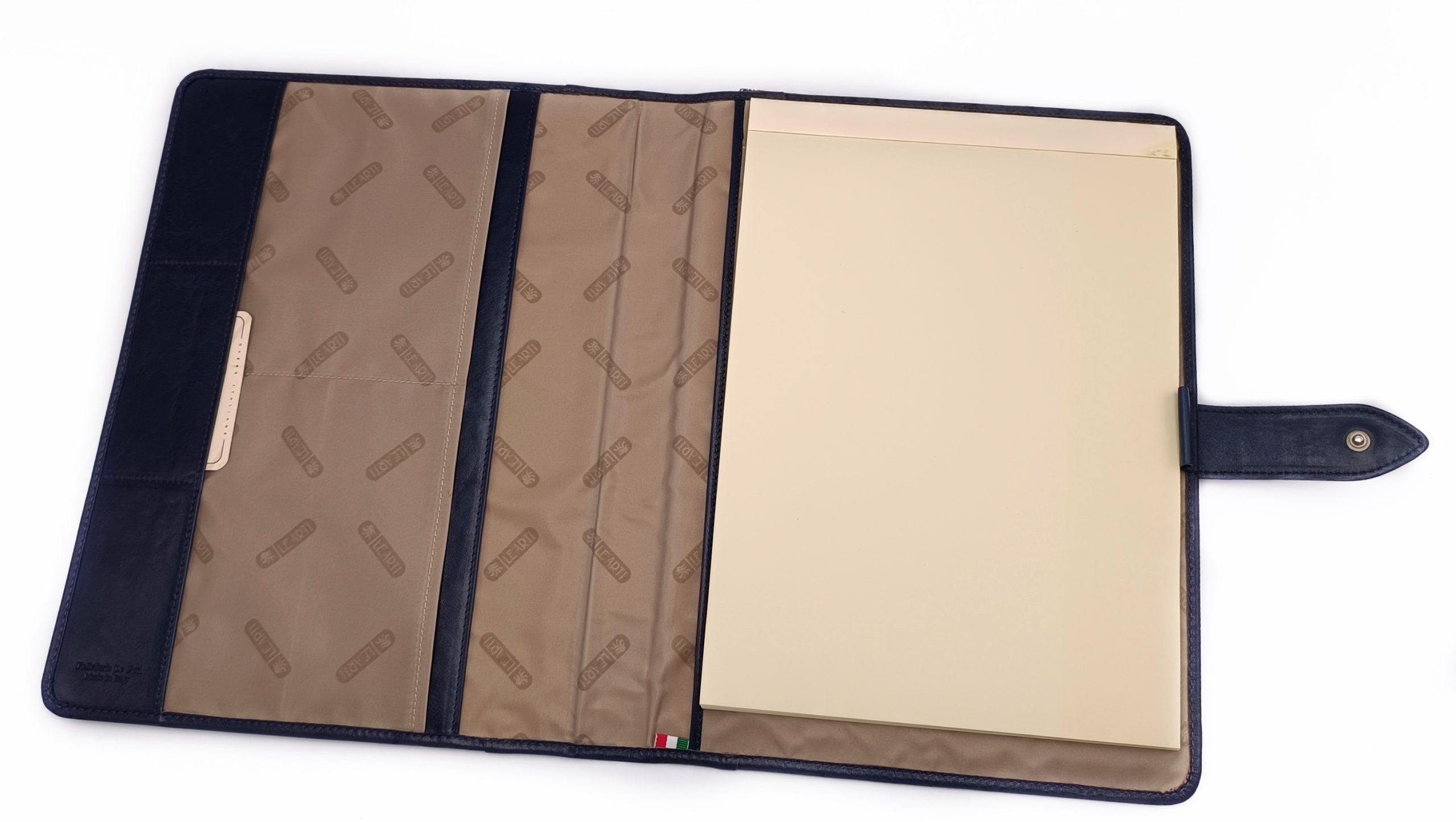 All’interno, due tache grandi porta documenti, due tasche piccole, tre comparti porta carta di credito, blocco 50 fogli A4 e passante porta penne. Chiuso con linguetta e bottone a pressione.