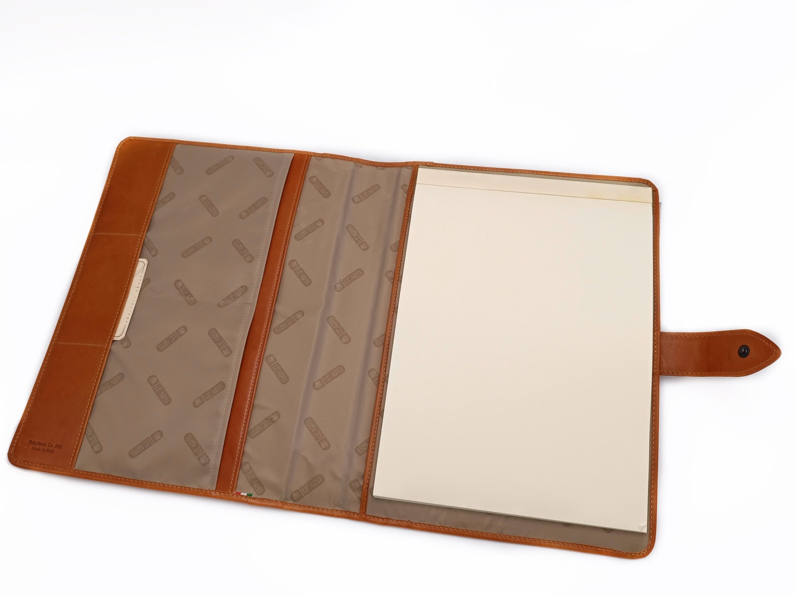 Porta blocco in pelle, con linguetta, finiture in tinta, logo impresso a fuoco.