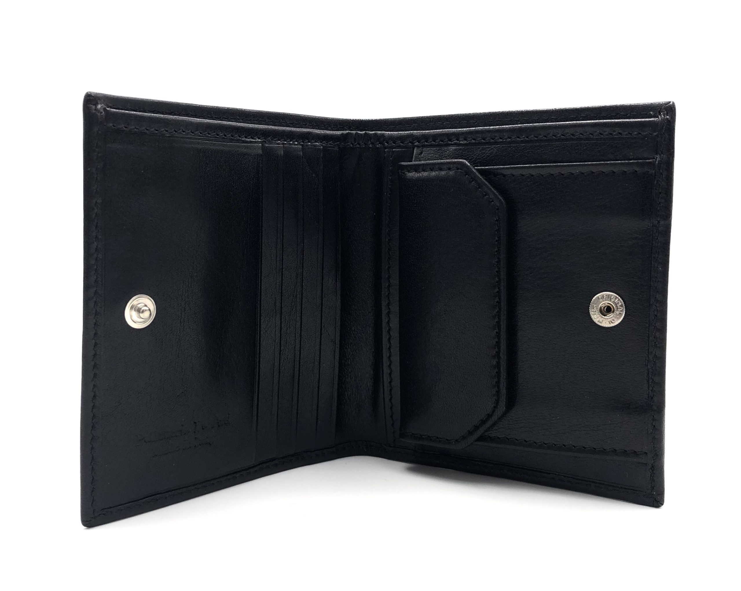 Quattro comparti per carte di credito, tre tasche per documenti, tasca porta monete chiusa con bottone a pressione e una tasca per banconote, chiuso con bottone a pressione.
