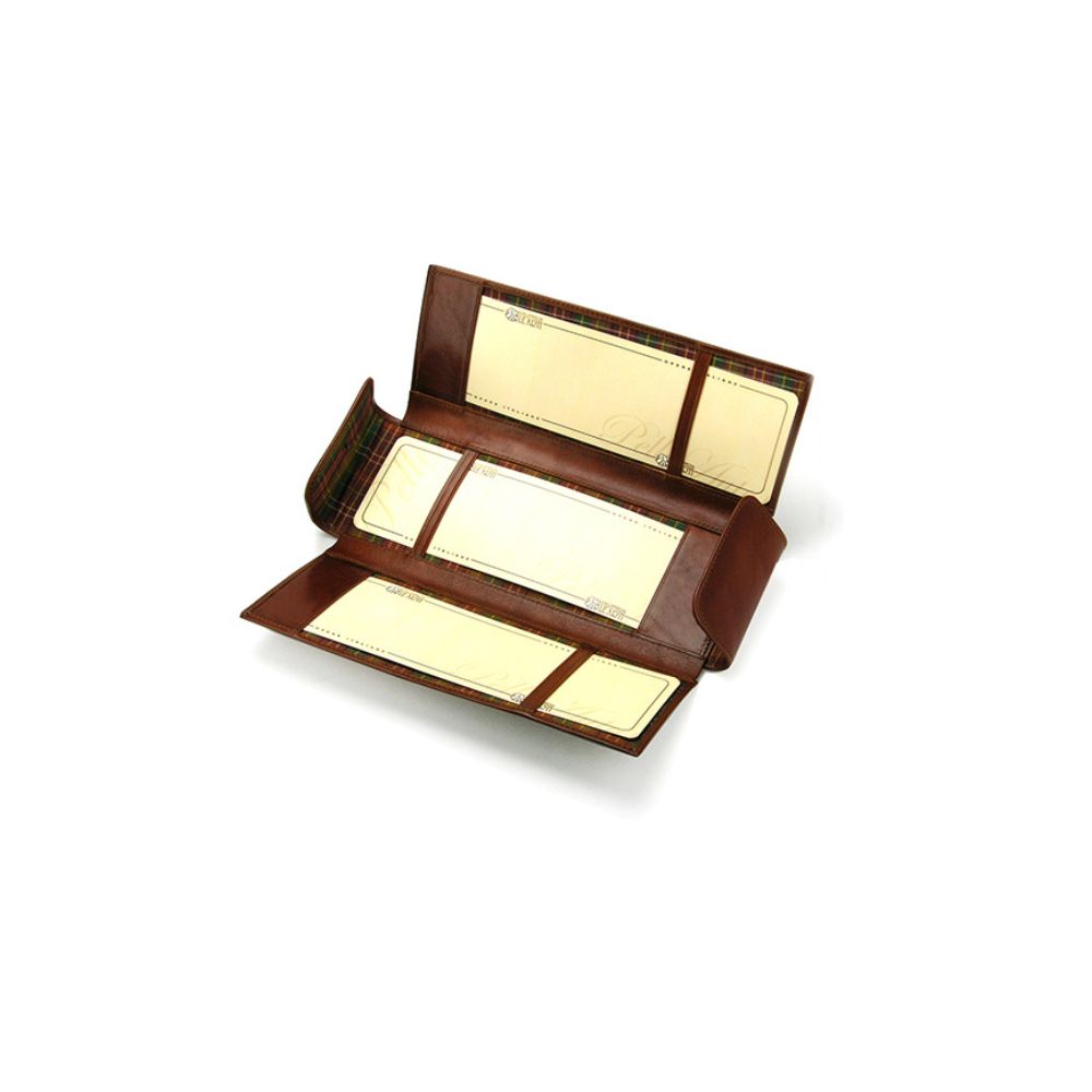 Tre tasca porta assegni lunghe 25 cm. Chiuso con due pattine laterali e bottoni a pressione, con un design particolare.