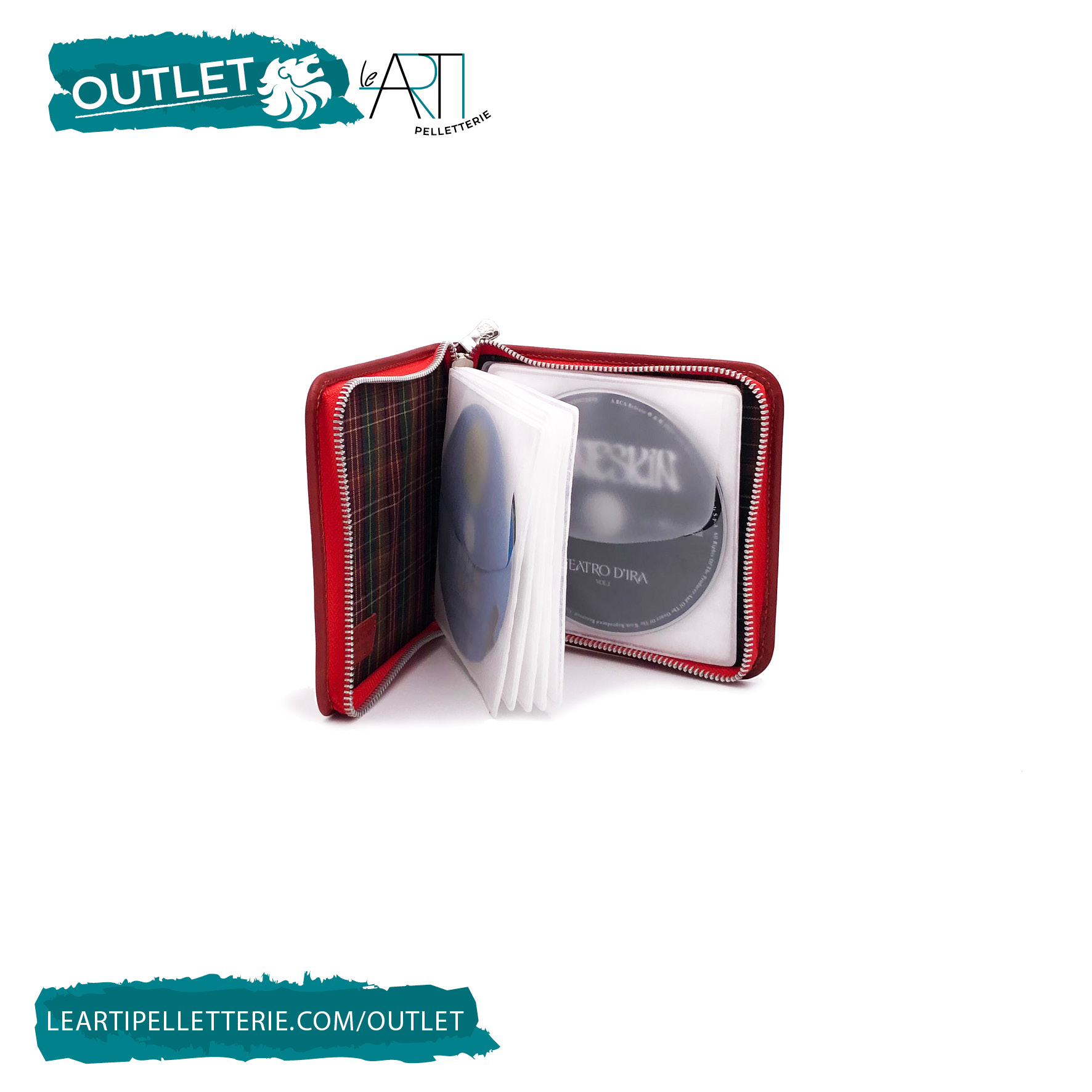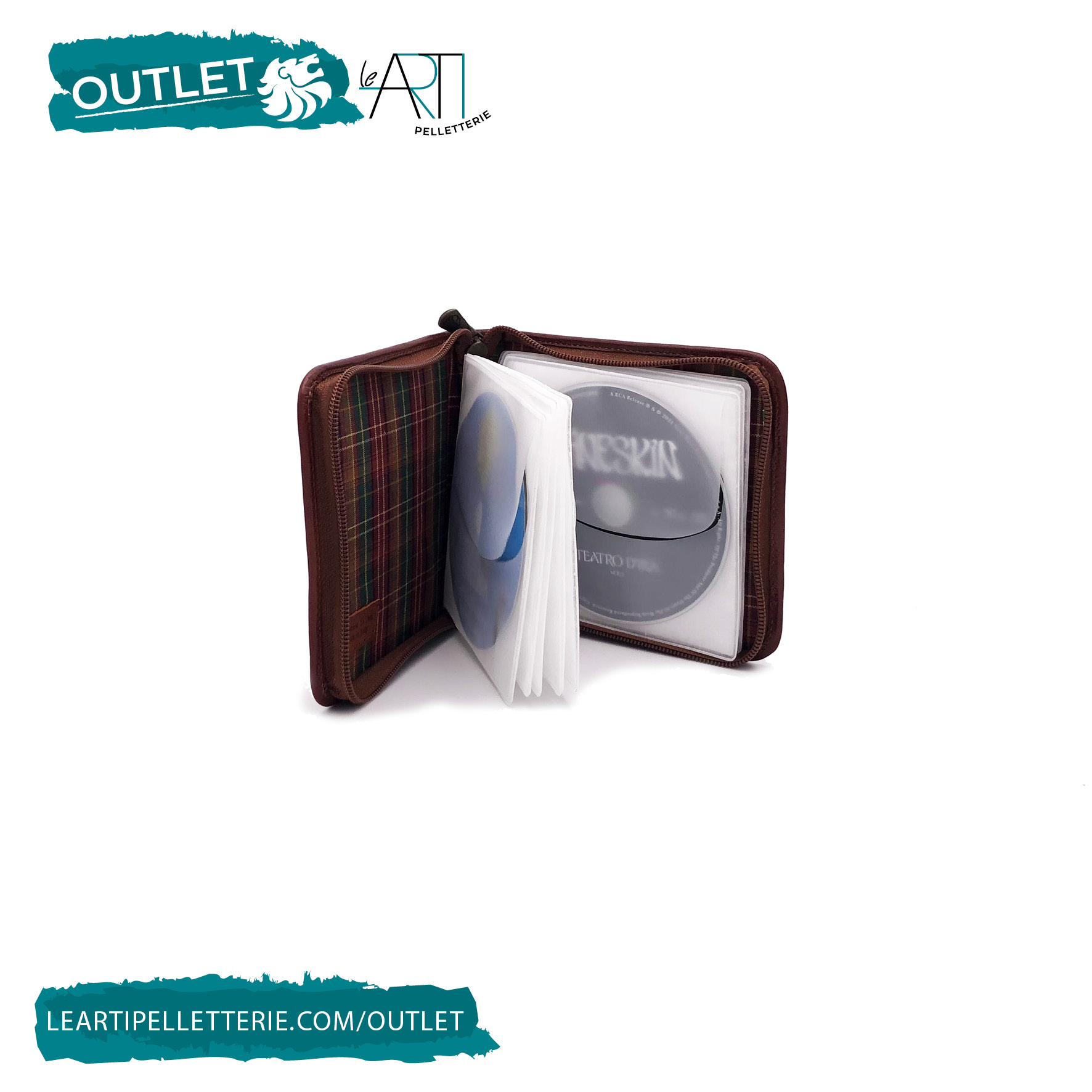 Raccoglitore porta CD in cuoio con finiture in tinta e logo impresso a fuoco, chiuso con zip